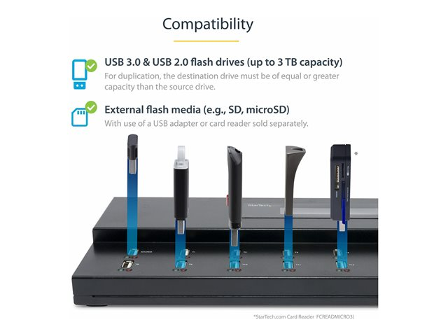 - Kopiera eller radera upp till 15 USB 3.0, USB 2.0 och USB 1.1-flashminnen utan att ansluta till en värddator