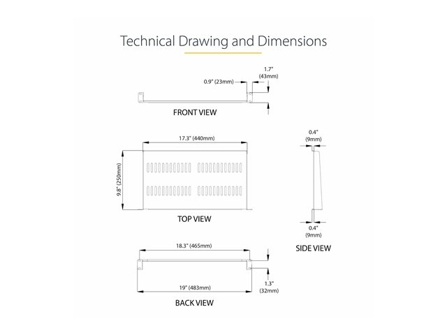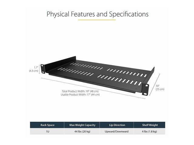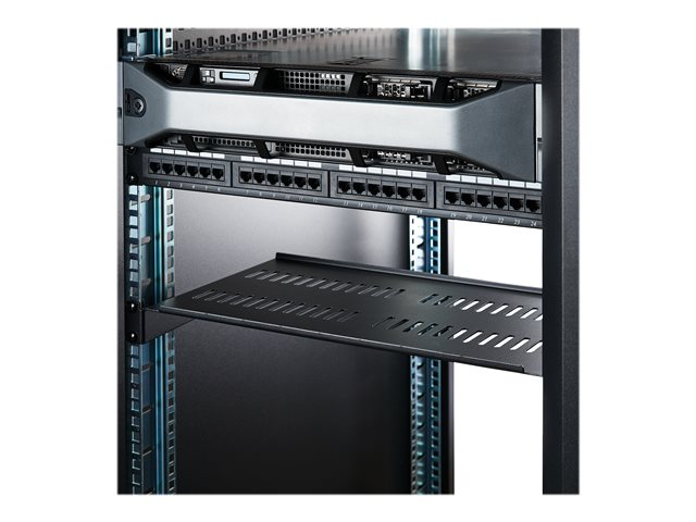 Universell ventilerad fribärande serverhylla med rackfäste för 19-tums nätverksutrustning i rack och skåp - Kraftigt stål - Viktkapacitet 23 kg - 25 cm djup hylla, svart - Hylla för rack - svart - 1U - 10"