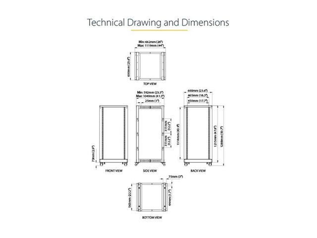 4 stolpar justerbart djup (59 cm till 104 cm) rack för nätverksutrustning med hjul/nivåfötter/kabelhantering (4POSTRACK25U) - Rack öppen ram - svart - 25U - för P/N: CABSCREWM5B, CABSCREWSM5, CABSCREWSM5B, CABSCREWSM62, CABSCREWSM6B, CABSCRWS1224